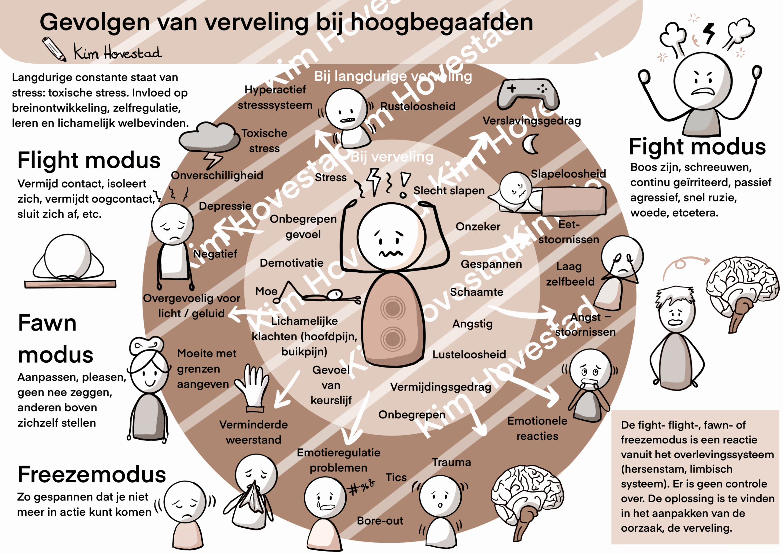 Deze praatplaat maakt in één overzicht duidelijk waarom langdurige verveling schadelijk is en waarom het echt noodzakelijk is om hoogbegaafde kinderen voldoende uit te dagen.