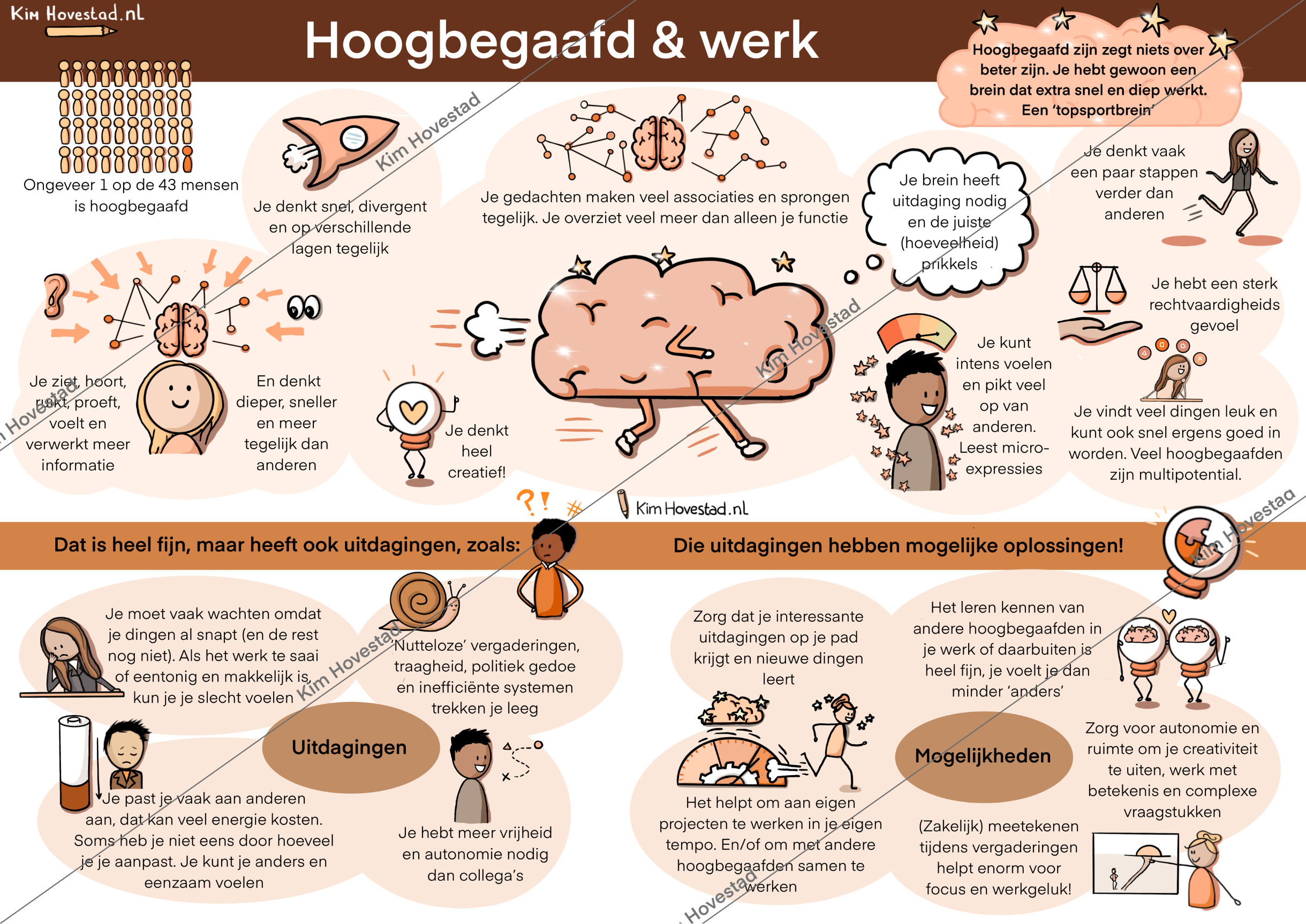 Deze praatplaat laat zien hoe hoogbegaafdheid zich op de werkvloer uit en waarom bepaalde situaties zo belastend kunnen zijn. Het is een kader dat helpt begrijpen wat er gebeurt.